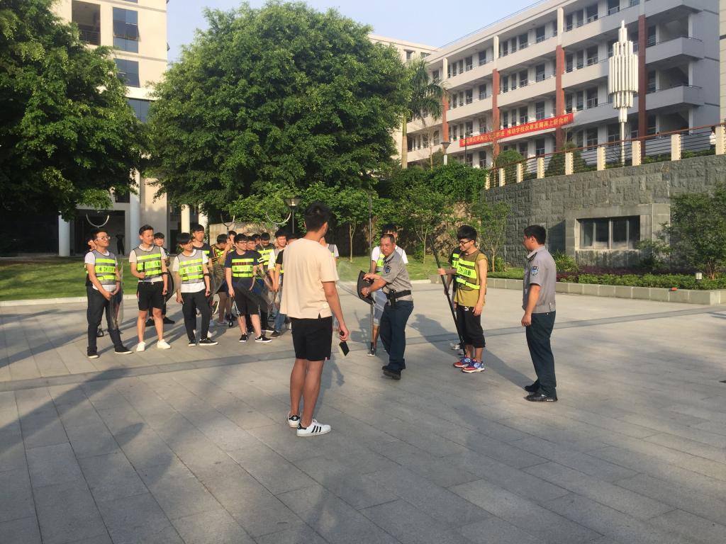 此次演练活动主要由盾棍相结合的人墙抵御战术演练及预设场景演练两大部分组成。首先,通过10名校安保人员进行了人墙抵御战术、盾棍实战对抗及应对突发事件时整体阵型攻防变化的演练示范,战术明确、气势高昂,充分展示了我校安保队伍服从命令、听从指挥的优良风气。第二部分,由31名学生进行战术学习及盾棍操作演练,并通过3对1的模式展开了预设场景演练,对手持管制刀具的“歹徒”,同学们临危不惧,形成扇形包围圈及盾棍结合的攻防阵型一一控制并制服“歹徒”。
