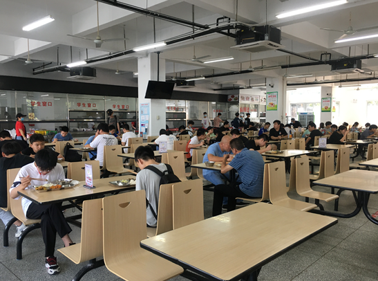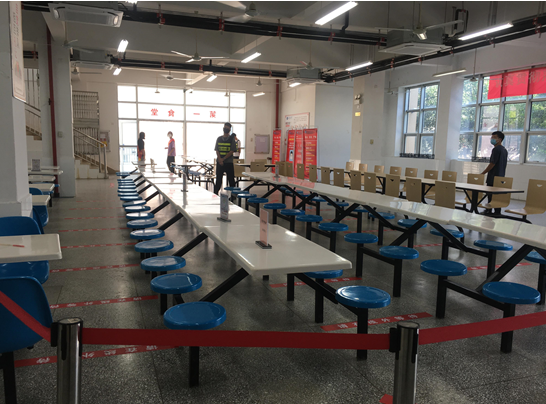 遵守一米线,对角线就坐,分时分批用餐,是全体师生们共同抗疫的无声行动。