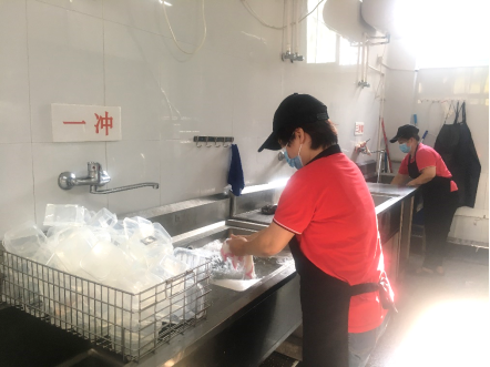 确保食堂清洁卫生。安排员工每日对食堂公共区域、后厨、洗手间等场所进行清洗和消毒,并在收银台放置酒精、免洗洗手液等防疫物品。严格执行操作间厨具、炊具的清洗消毒、食品安全检查和留样等规范操作,并严格按要求记录。