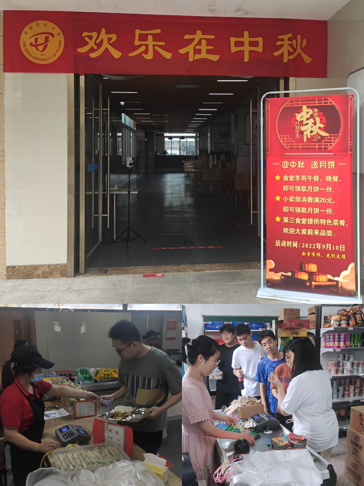 中秋节当天,食堂推出特色美味佳肴、各色水果饮料,菜品焕然一新,让同学们感受到来自食堂的真情与祝福。