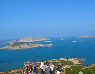 第四站游览“日月岩”。站在日月岩,东半岛的风光尽收眼底,高大的风力发电机从山上架设到海里,整齐的网箱均匀的分布在海平面上,远处的岛屿、轮船、礁石、海浪、阳光,随手一拍都非常出彩,优美的海岛风光令人啧啧称奇。