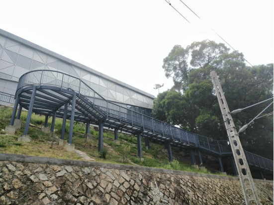 在铁路实训场的边坡上,新架设了一座迂回盘旋的钢结构栈道。栈道全长约100米,在建造过程中克服高边坡施工难度,尽量减少对原有树木和毛石挡墙的破坏,通过三级台阶、两个转弯的设计,巧妙的将栈道、树木、边坡等要素结合在一起,与新改建的体育馆相互映衬。在山脚下看,就像缩小版的校园“福道”,通往下一个景点——后山体育场馆也更加便捷。