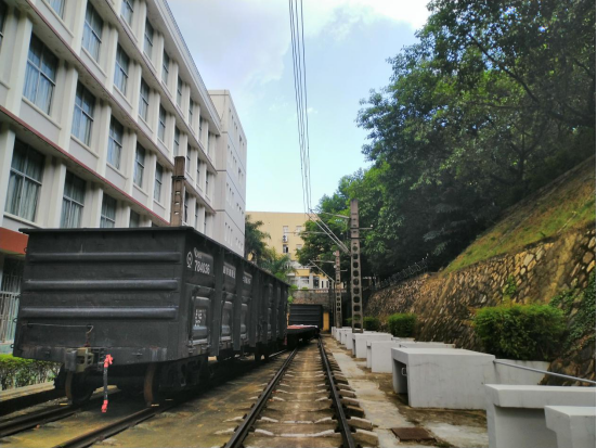 在明德楼背后,有一段铁轨和两节车厢,这可是职业学院最能体现“铁路特色”的地方,也是福建唯一一所校内建有铁路的学校。以前这里有两股完整的交汇轨道和客货车厢,现在只剩下平板式、无盖集装箱式车皮,信号灯、指示牌、电线杆、水电供给装置一应俱全,是一段标准的电气化铁路。砌筑整齐的毛石挡墙、道砟、跌水井、排水沟,也是铁道工程路基、护坡施工的最好教材。每逢大雨,后山上的积水会顺着暗沟涌入跌水井,像一道拱门瀑布。