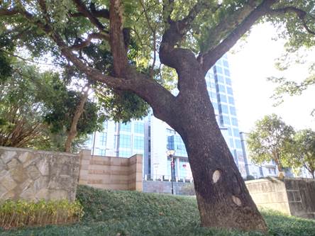 沿着校门左侧人行道行走约100米,道路右侧坡上有一棵生长旺盛的大樟树,树干倾斜、形态优美、枝繁叶茂,要两个人才能和抱起来,这棵树可是学校的老寿星,一棵龙眼树和两棵大榕树围绕左右。
