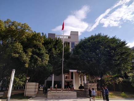 在明德楼前的广场右侧,百年香樟旁,有一个精致小巧的国旗台,四周绿树成荫。这里原来是一个坡地,为了让全校师生有一个便于平时活动和集会的场所,新建了国旗台。旗台呈正方形,台阶分布两侧,四周立有不锈钢柱配红色挂绳。国旗杆有十米多高,内置电动升降装置,升旗的时候,只要按一下遥控器,国旗就伴着雄壮的国歌声冉冉升起。校园的中心区域,又多了一个进行爱国主义教育的场所。